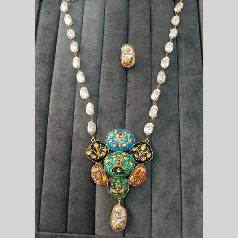 Unleash your inner diva with the FS Collection Artistic Gold Plated Elegance Multi-Color Meenakari Long Necklace Set a masterpiece of traditional craftsmanship and vibrant artistry. This stunning jewelry set brings together the beauty of intricate Meenakari work, the richness of gold plating, and the natural elegance of multi-color mother of pearls, creating a truly regal accessory for festive and special occasions…….. Note: Image may vary slightly from the actual product