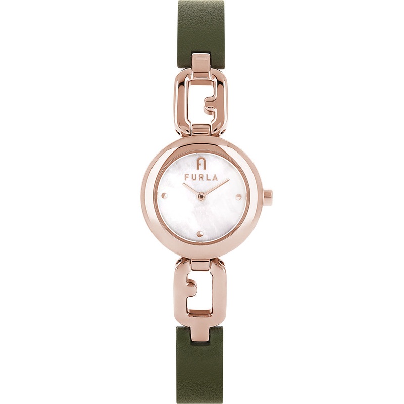 Introducing the Furla Arco Chain, an exquisitely petite and delicate timepiece. Boasting a dainty 25mm case with a lustrous rose gold tone finish, it exudes elegance. The crystal detailing around the bezel imparts a hint of sparkle, while the olive-green g