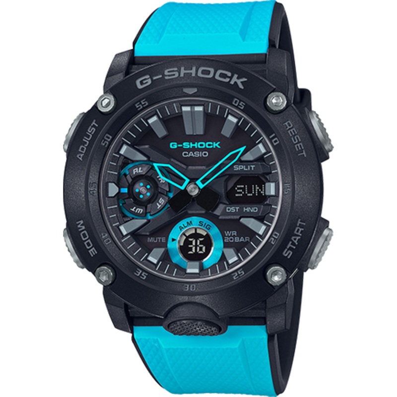 Engineered for endurance and designed with striking style, the G-Shock Carbon Core Blue Band Watch GA2000-1A2 redefines toughness in a men’s watch. Its bold 51mm case combines lightweight carbon and resin to create a durable shell that resists shocks, cracks, and deformation. The vivid blue resin band offers a confident contrast to the black dial, while the analog-digital display ensures both style and functionality are always in sync. With 200-meter water resistance, world time, stopwatch, countdown timer, and five daily alarms, this watch excels in both urban and adventure settings. Mineral glass and a dual-layer back cover enhance resilience, while the Carbon Core Guard structure provides next-gen protection. Ideal for casual and sport lifestyles, this timepiece is a standout in its category, delivering a modern fusion of rugged aesthetics and precision quartz movement.