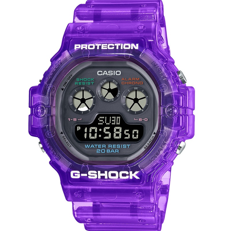 Keeping up to date with constant innovation and improvement, G-SHOCK continues to push the limits of toughness since 1983. This model DW5900JT-6D is a part of the Joytopia collection that conveys a retro-futuristic look and feel with semi-transparent primary colours. The clear and semi-transparent colours and design combines with digital functionality to create bold collection of eye-attention-grabbing timepieces. – 51.4 46.8 15.5mm Case Size – 60g Weight- Resin Band, Case and Bezel – Shock Resistant- 200 Meters Water Resistant- Approx. battery life: 5 years on CR2025- Mineral Glass- World time: 29 time zones (48 cities), daylight saving on/off- Stopwatch- Timer- Alarm/hourly time signal- Electro-luminescent backlight- Calendar: Full auto-calendar (to year 2099)- Mute feature: Button operation tone on/off- Accuracy: 15 seconds per monthOther features- 12/24-hour format- Regular timekeeping: Hour, minute, second, pm, date, day