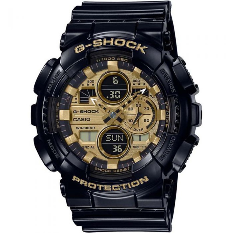 The G-Shock GA-140GB-1A1DR Black and Gold Watch, where sophistication meets durability in a sleek package. With its bold design and meticulous craftsmanship, this timepiece is a statement of both style and strength. Boasting a substantial 55 51.2 16.9mm case and a weight of 72g, it exudes presence without compromising on comfort. Crafted with a resilient resin band, bezel, and case, it’s built to withstand the rigors of your active lifestyle. Equipped with shock resistance, magnetic resistance, and 200 meters water resistance, it’s prepared for any adventure. Powered by a CR1220 battery, it offers approximately 2 years of reliable performance. With features like world time, stopwatch, timer, and five daily alarms with a snooze function, it ensures you stay on track no matter where you are. The LED light with auto-switch and selectable illumination duration guarantees visibility in any lighting condition. Complete with a full auto-calendar extending to the year 2099 and precise timekeeping, the GA-140GB-1A1DR is more than just a watchit’s a reliable companion for the modern explorer.- 55 51.2 16.9mm Case Size- 72g Weight- Resin Band, Bezel and Case- Shock Resistant- Magnetic Resistant- 200 Meters Water Resistant – Approx. battery life: 2 years on CR1220- Mineral Glass- World time: 29 time zones (48 cities + coordinated universal time), daylight saving on/off, home city/world time city swapping- Stopwatch- Timer- Alarm/hourly time signal: 5 daily alarms (with 1 snooze alarm)- Hourly time signal- LED light: Auto light switch, selectable illumination duration (1.5 seconds or 3 seconds), afterglow- Calendar: Full auto-calendar (to year 2099)- Accuracy: 15 seconds per month- 12/24-hour format- Regular timekeeping:*Analog: 2 hands (hour, minute (hand moves every 20 seconds)), 1 dial (speed)*Digital: Hour, minute, second, pm, month, date, day