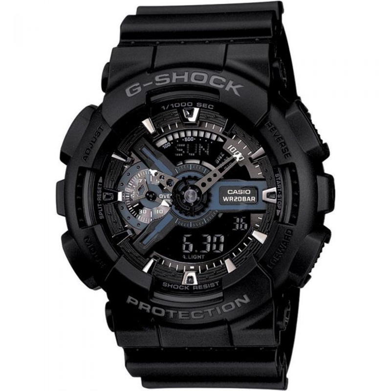 The G-Shock GA110-1B Black Watch is a sleek and versatile timepiece built for adventure. With a case size of 55 51.2 16.9mm and a weight of 72g, it balances durability and comfort effortlessly. Its resin case, band, and bezel ensure shock and magnetic resistance, while offering water resistance up to 200 meters. Powered by a CR1220 battery, it provides approximately 2 years of reliable use. The watch features mineral glass for scratch resistance and world time functionality covering 29 time zones and 48 cities. Essential features include a stopwatch, timer, and 5 daily alarms with a snooze option. Additionally, it includes an LED light with selectable illumination duration and afterglow, along with a full auto-calendar extending to 2099. Accuracy is guaranteed at 15 seconds per month, with the option for both 12 and 24-hour formats. The analogue-digital display offers comprehensive timekeeping and data.- 55 51.2 16.9mm Case Size – 72g Weight- Resin Case, Band and Bezel – Shock Resistant- Magnetic Resistant- 200 Meters Water Resistant – Approx. battery life: 2 years on CR1220- Mineral Glass- World time: 29 time zones (48 cities + coordinated universal time), daylight saving on/off, home city/world time city swapping- Stopwatch- Timer- Alarm/hourly time signal: 5 daily alarms (with 1 snooze alarm)- LED light: Auto light switch, selectable illumination duration (1.5 seconds or 3 seconds), afterglow- Calendar: Full auto-calendar (to year 2099)- Accuracy: 15 seconds per month- 12/24-hour format- Regular timekeeping:*Analog: 2 hands (hour, minute (hand moves every 20 seconds)), 1 dial (speed)*Digital: Hour, minute, second, pm, month, date, day