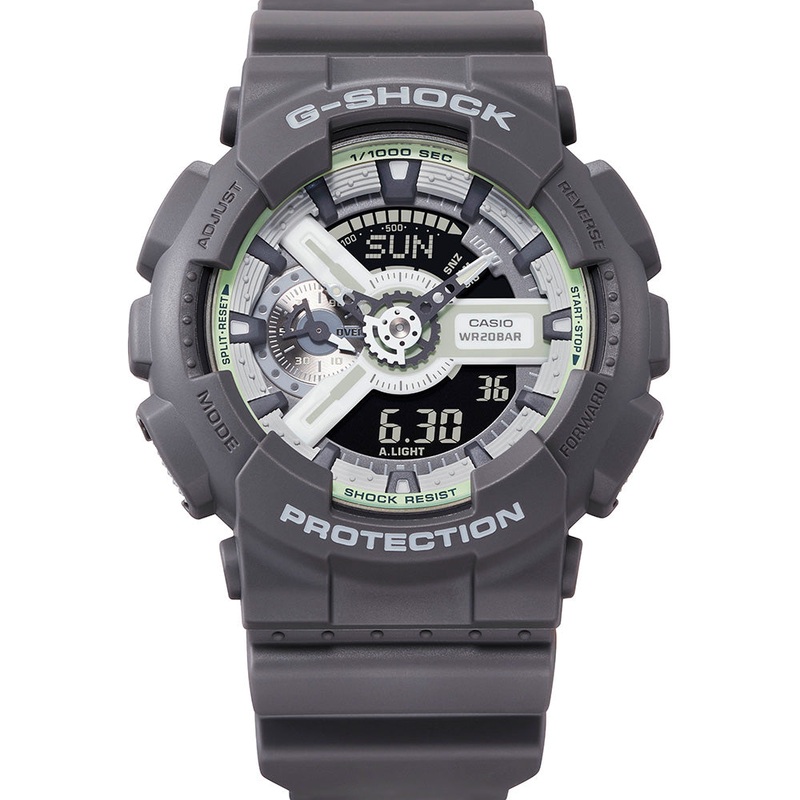 This new G-SHOCK GA110HD-8A is a part of the new G-SHOCK Hidden Glow Series, the design inspiration drawn from the hidden talents we all possess but rarely show off. This stylish grey, black and white look is constructed with a phosphorescent face that glows a vibrant bright green in the dark. Known for their continuous innovation, effortless toughness, and beauty this timepiece upholds that, offering functionality to its best ability with seamless design. Discover these watches hidden identity in the dark and be wowed by its eccentric luminescent features. – 55 51.2 16.9mm Case Size – 72g Weight – Resin Case, Bezel and Band- Shock Resistant- Magnetic Resistant- 200 Meters Water Resistant – Approx. battery life: 2 years on CR1220- Mineral Glass- World time: 29 time zones (48 cities + coordinated universal time), daylight saving on/off, home city/world time city swapping- Stopwatch- Timer- Alarm/hourly time signal: 5 daily alarms (with 1 snooze alarm)- LED light: Auto light switch, selectable illumination duration (1.5 seconds or 3 seconds), afterglow- Calendar: Full auto-calendar (to year 2099)- Accuracy: 15 seconds per month- 12/24-hour format- Regular timekeeping:*Analog: 2 hands (hour, minute (hand moves every 20 seconds)), 1 dial (speed)*Digital: Hour, minute, second, pm, month, date, day