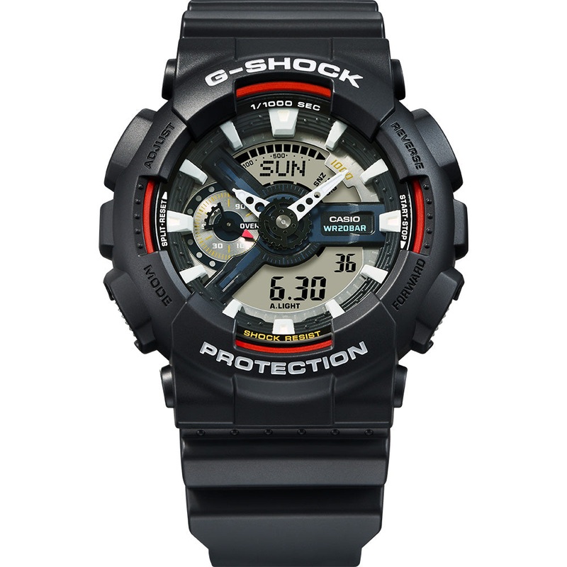 The G-Shock GA110RL-1A Digital and Analog Watch boasts a bold black case, duo-display dial, and matching black strap, combining rugged durability with advanced functionality. Reflecting G-SHOCKs brand colours, the watch features red for passion, blue for water resistance, and yellow for shock resistance, symbolizing the spirit of G-SHOCK. With a case size of 55 x 51.2 x 16.9mm and weighing 72g, its built for toughness, with shock resistance and magnetic resistance (ISO standard 764). The LED light includes an auto light switch, selectable illumination duration, and afterglow.This watch offers world time with 29 time zones across 48 cities and coordinated universal time, along with a 1/1000-second stopwatch and countdown timer. It also includes 5 daily alarms, with one snooze alarm, and a full auto-calendar up to the year 2099. Regular timekeeping shows analog hour and minute hands (with the minute hand moving every 20 seconds), along with a speed dial and digital display for hour, minute, second, pm, month, date, and day. The GA110RL-1A is accurate to 15 seconds per month, with a 2-year battery life on a CR1220.- Module No. 5146- 55 x 51.2 x 16.9mm Case Size – 72g Weight- Shock resistant (G-SHOCK)- Magnetic resistant (ISO standard 764)- LED light: Auto light switch, selectable illumination duration (1.5 seconds or 3 seconds), afterglow- World time: 29 time zones (48 cities + coordinated universal time), daylight saving on/off, home city/world time city swapping- 1/1000-second Stopwatch- Countdown Timer- 5 Daily Alarms (with 1 snooze alarm)- Full auto-calendar (to year 2099)- 12/24-hour format- Regular timekeeping*Analog: 2 hands (hour, minute (hand moves every 20 seconds)), 1 dial (speed)*Digital: Hour, minute, second, pm, month, date, day- Accuracy: 15 seconds per month- Approx. battery life: 2 years on CR1220