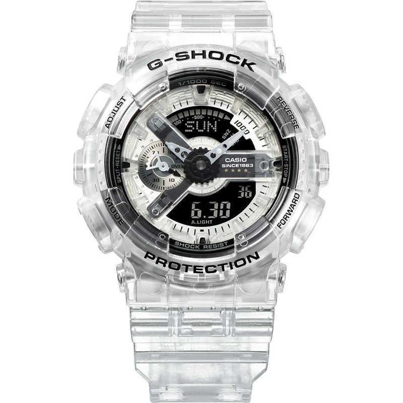 In celebration of the G-SHOCK 40th Anniversary Clear Remix lineup, this timepiece offers you a clear behind the scenes at the deconstructed components. Made with see through materials on the band, case, dial, LCD, and buttons offers an exposed look at the watches in this lineup. The design concept of this timepiece offers an exceptional view through this limited-edition G-SHOCK. – 55 51.2 16.9mm Case Size – 78g Weight – Resin Case and Bezel – Resin Band- Shock Resistant- Magnetic Resistant- 200 Meters Water Resistant – Approx. battery life: 2 years on CR1220- Mineral Glass- World time: 29 time zones (48 cities + coordinated universal time), daylight saving on/off, home city/world time city swapping- Stopwatch- Timer- Alarm/hourly time signal- LED light- Calendar: Full auto-calendar (to year 2099)- Accuracy: 15 seconds per monthOther features- 12/24-hour format- Regular timekeeping:Analog: 2 hands (hour, minute (hand moves every 20 seconds)), 1 dial (speed)Digital: Hour, minute, second, pm, month, date, day