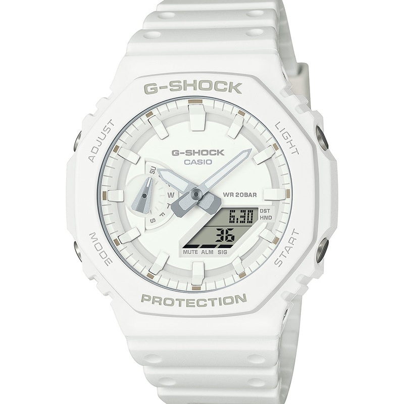Presenting the G-Shock GA2100-7A7 One-Tone Gradation White Watch. With its striking one-tone gradation white design and robust construction, this timepiece combines style and durability. With a sleek design featuring a carbon/bio-based resin case and bezel, and a bio-based resin band, this timepiece is both eco-friendly and durable. It boasts a shock-resistant Carbon Core Guard structure and 200 meters water resistance, making it suitable for various activities. Powered by dual SR726W batteries, it offers approximately 3 years of battery life. The watch includes essential features such as world time with 31 time zones, stopwatch, timer, and 5 daily alarms. Its double LED light ensures visibility in low-light conditions, while the full auto-calendar and mute feature enhance functionality. With 15 seconds per month accuracy and hand shift feature, it provides precise and unobstructed timekeeping. Whether for everyday wear or outdoor adventures, this watch offers reliability and style.- 48.5 45.4 11.8mm Case Size – 51g Weight- Carbon/Bio-based resin Case and Bezel – Bio-based Resin band- Shock Resistant- Carbon Core Guard structure- 200 Meters Water Resistant – Approx. battery life: 3 years on SR726W X 2- Mineral Glass- World time: 31 time zones (48 cities + coordinated universal time), daylight saving on/off- Stopwatch- Timer- Alarm/hourly time signal: 5 daily alarms- Hourly time signal- Double LED light- Calendar: Full auto-calendar (to year 2099)- Mute feature: Button operation tone on/off- Accuracy: 15 seconds per month- 12/24-hour format- Hand shift feature (Hands move out of the way to provide an unobstructed view of digital display contents.)- Regular timekeeping:*Analog: 2 hands (hour, minute (hand moves every 20 seconds)), 1 dial (day)*Digital: Hour, minute, second, pm, month, date