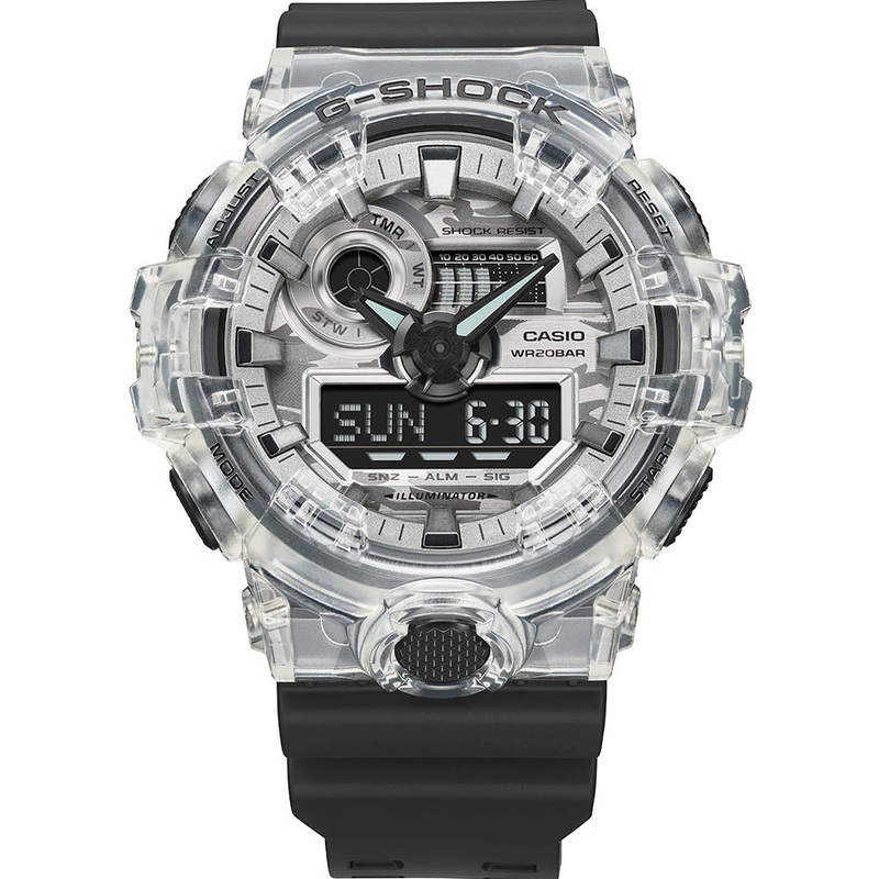 A bold piece, this G-Shock GA700SKC-1A Transparent Mens Watch is interesting in its design. The watch is crafted in durable resin with a black bracelet that sits comfortably on the wrist and is a basic colour for everyday wear. Enjoy something different with a transparent case that lets this watch be especially versatile. There is both an analogue display and digital display including a compass and alarm. Enjoy the durability of a G-Shock watch with shock resistance and 20bar water resistance, you can take on your biggest adventures with this piece!