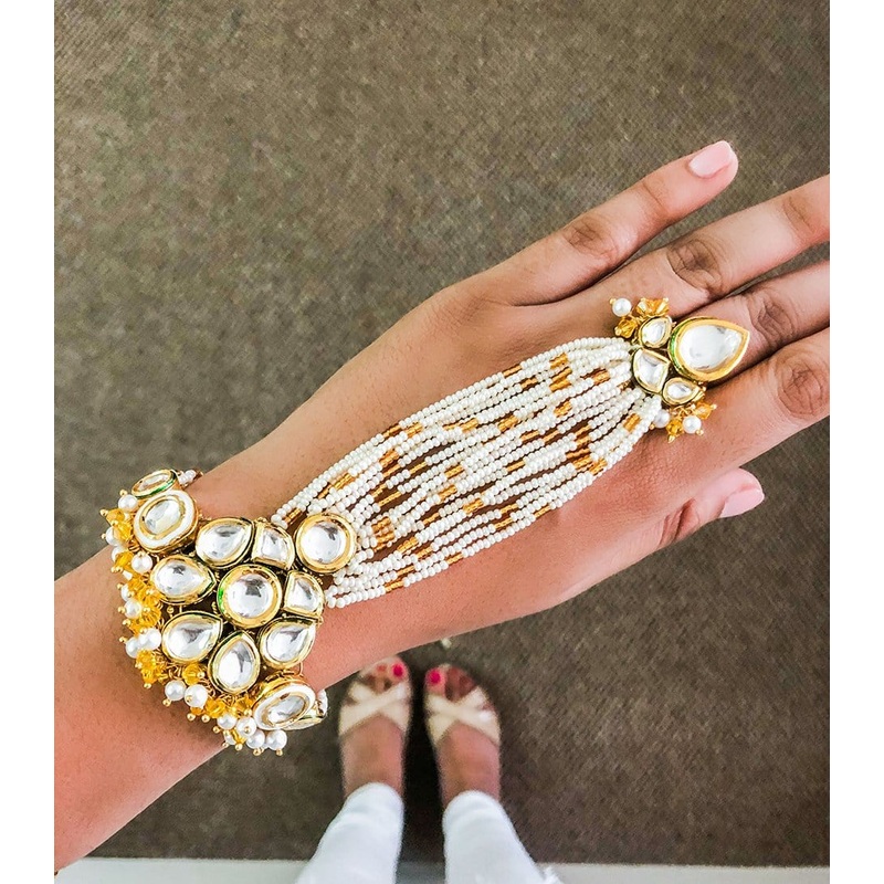 Expertly crafted with adelicatestring of pearls and kundanwork, the Gauhar Hand Harness will adornyour hand beautifully.