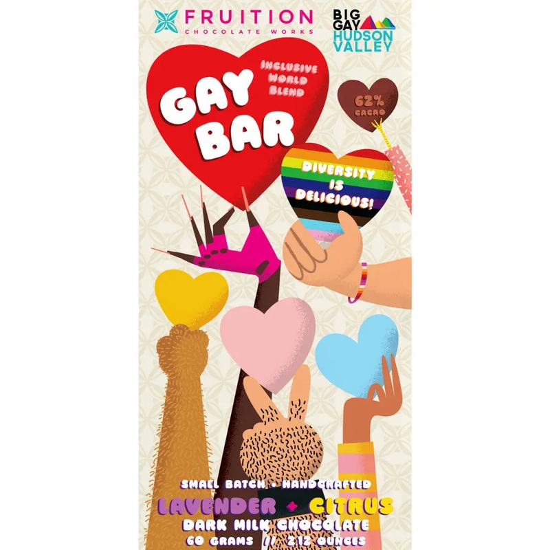Belly up to the Gay Bar and take a bite out of the Big Gay Hudson Valley with an all-new sweet & sassy treat from Fruition Chocolate Works. This globally sourced 62% cacao dark milk bar is made with an inclusive world blend of beans which have been kissed with floral lavender and zesty citrus.