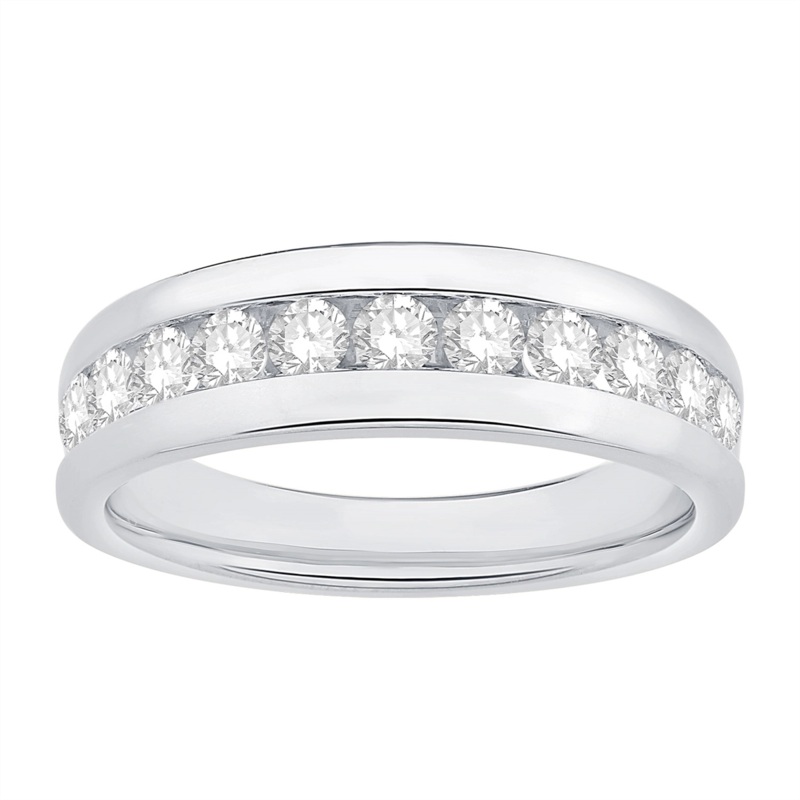 Gents diamond band in 14 karat white gold. Set in the band are 11 round brilliant cut diamonds with a total weight of 1.00 carat.