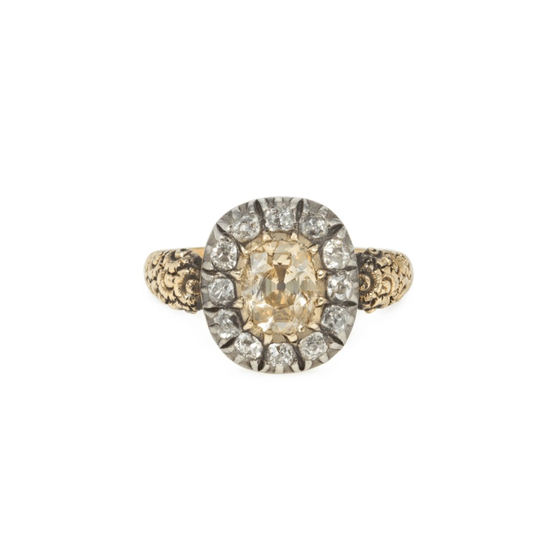 This antique colored diamond cluster ring is a Georgian-era piece, dating back to the 1830s. The design features an old European-cut diamond at the center, surrounded by single-cut diamonds and foliate-carved shoulders, all set in 18kt yellow gold. The total approximate weight of the diamonds is 3.75 carats with the central stone weighing around 0.33 carats. This vintage ring weighs 5 grams and measures 3/8″ wide and 1/2″ long with a size of 6.75 (US) which can be resized if necessary.