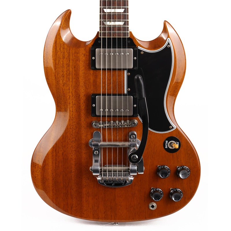 This is a lightly used and still in excellent condition Gibson Custom Shop ’62 SG in a VOS Sunshine finish over the mahogany body. A previous owner installed a Bigsby tailpiece with a Vibramate mounting kit so that no extra holes needed to be drilled into the body. The original case and COA are included!