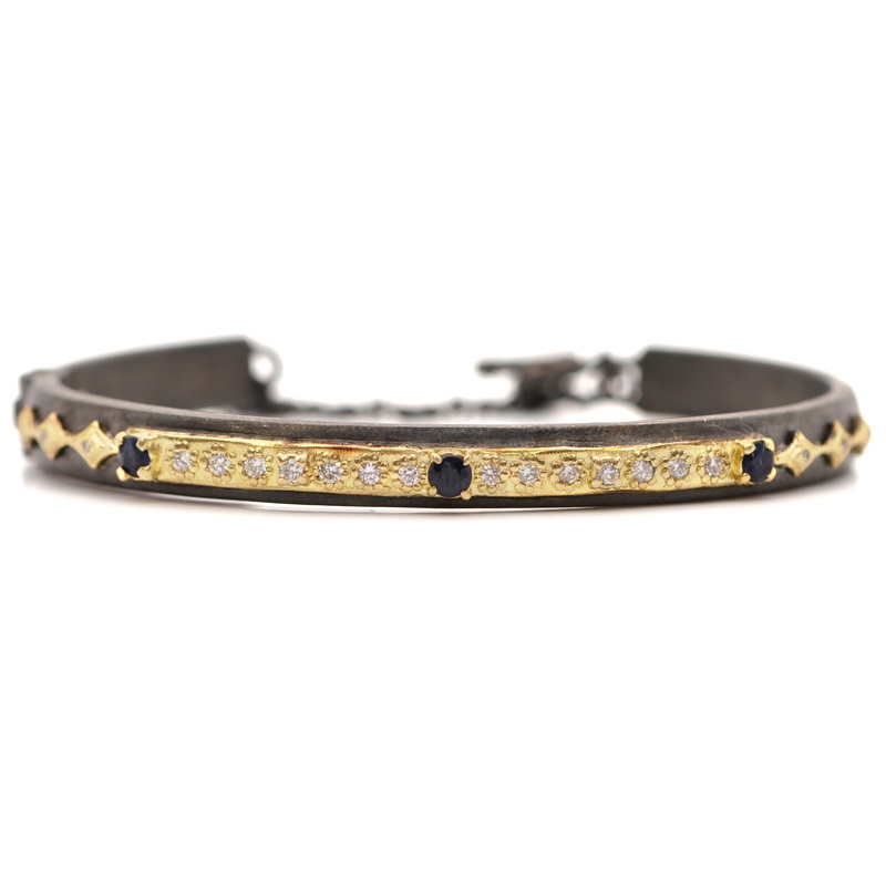 18k Yellow Gold and Blackened rhodium finish Sterling Silver kick cuff featuring gold bar with crivellis, blue sapphire and 0.31TCW white diamonds. Safety chain with toggle closure. Measures 6mm wide.