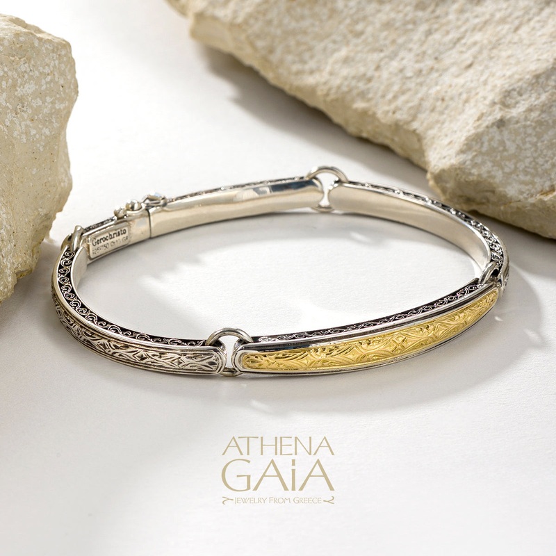 A flexible bracelet in sterling silver with solid 18k gold facea delicate yet durable piece by Gerochristo. Designed with intricate detailing, this bangle is perfect for everyday wear and can be stacked with other bracelets for a unique look.