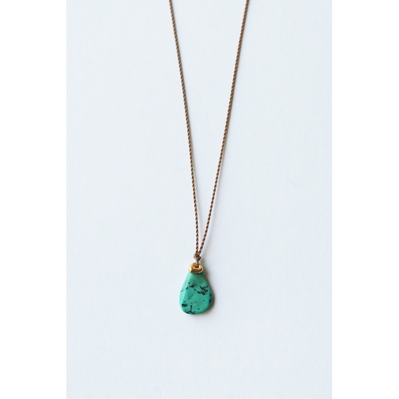 A small Turquoise raindrop bead, paired with an 18 karat gold nugget bead. Simple and joyful. The Turquoise bead measures about 10mm long, and the gold nugget is 4mm in diameter. On a beige nylon cord measuring 16 inches long, with a 14k gold spring clasp.