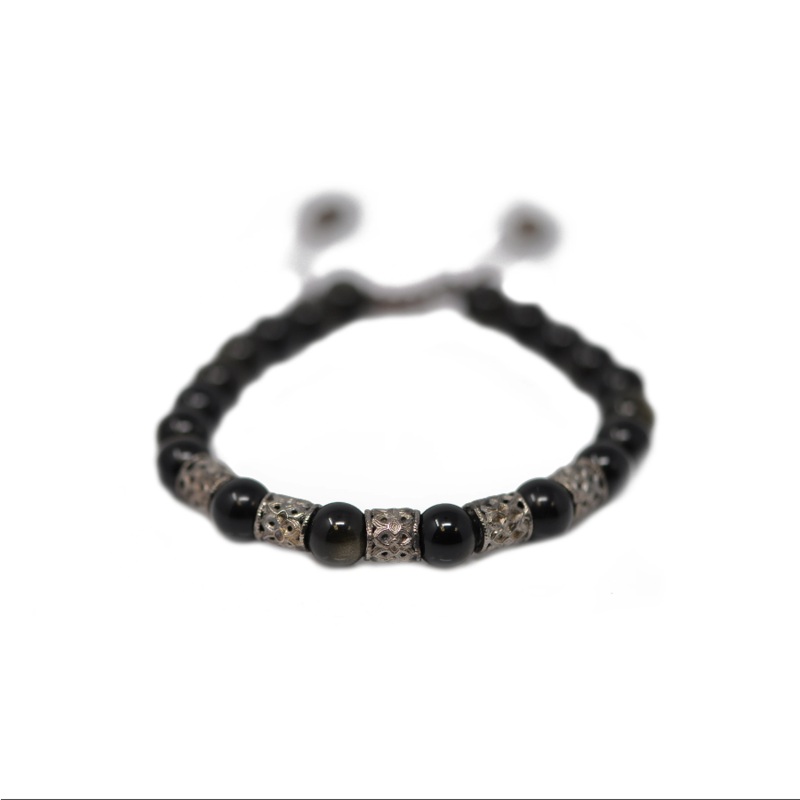 Gunmetal Sterling Silver beaded adjustable beaded bracelet with 8mm Golden Obsidian, 5 carved texture stations and monogrammed pulls.