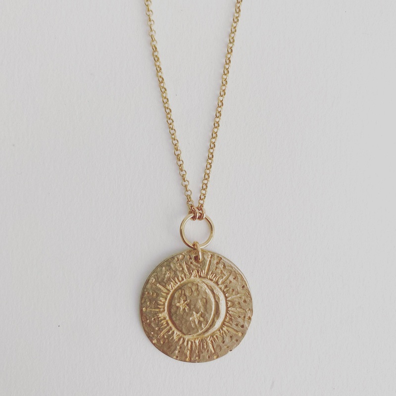 Hand carved bronze goodnight moon coin necklace with a beautiful 18 rolo chain, 1 extender chain and spring clasp. With the coin the necklace drops to 20. Pendant measures 20mm across at its widest point. All pieces are handmade in Aspen