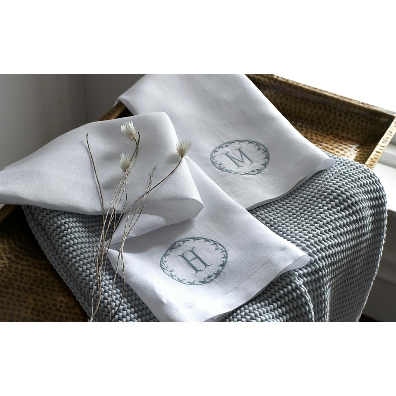 The distinctive fishtail typeface and medallion on our Carta guest towel lends itself beautifully to the bath. Create a monogram in Pool on 100% linen.100% linen.Made in the USA of fabric from Italy.All of our fabrics are OEKO-TEX Standard 100 certified, m