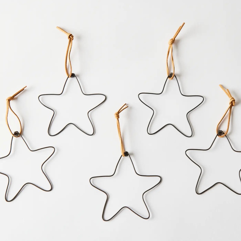 Adorn gifts, stockings, and more with these hand-crafted wire star ornaments! Finished with a matte varnish and a leather loop, these stars are crafted in Tampa, FL studio.