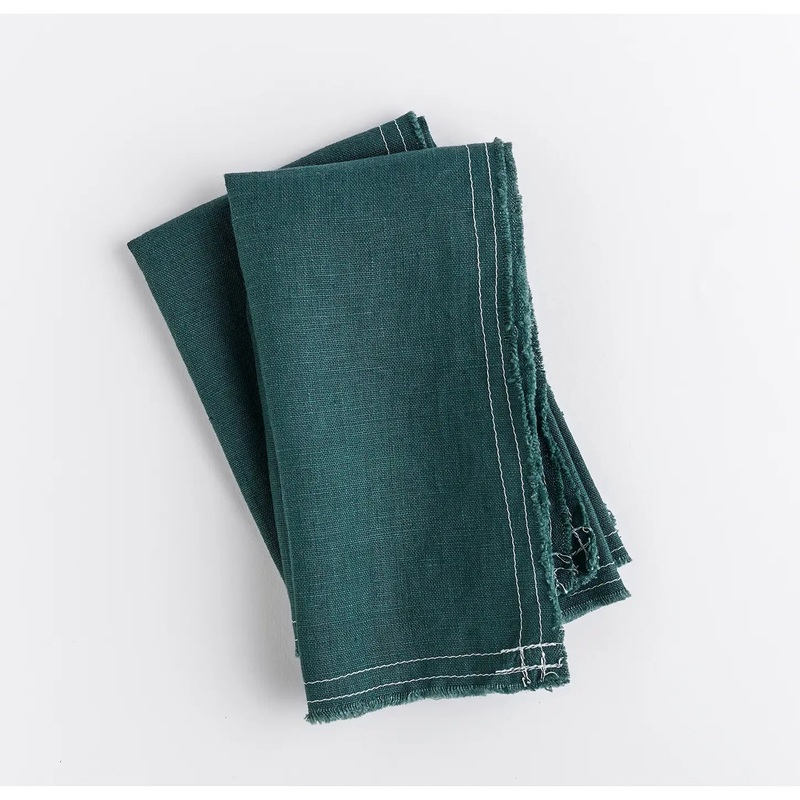 Transform your table with these deep green linen napkins! Their timeless design gives your tablescape a rustic, yet polished feel. Enjoy their cozy softness each day or save them for special moments. Plus, washing only makes them gentler and more comfortable to the touch. Show off the natural details of linen with confidenceThe unfinished edges will unravel the first couple of times that linens are washed. Just trim the frayed edges with scissors if needed.