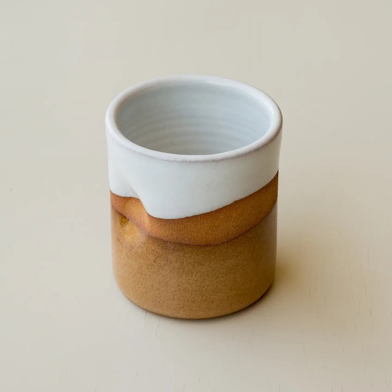 Inspired by an evening scramble across the desert rock. Timeless white, rich rust and a bit of exposed stoneware gives the Drifter Tumbler its handsome look. The small indention on the side makes for the perfect no-handle handle for your thumb. *Each piece is handmade. Slight variations between pieces can be expected. FEATURES: Classic White Glazed Top And Inside / Rich Rust Glazed Bottom / Exposed Textured Stoneware Middle / Thumb Indent / 12oz / Handmade in California MATERIALS: High-Fire Ceramic Stoneware / Lead Free Glaze CARE: Microwave & Dishwasher Safe / Food & Drink Safe