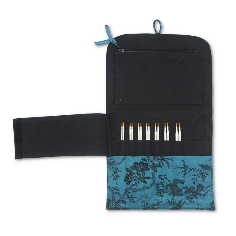 Cable colors may vary. Each set also includes a practical and portable brocade case and needle grips. Assorted fabric cases. Tip length is approximately 5 inches.