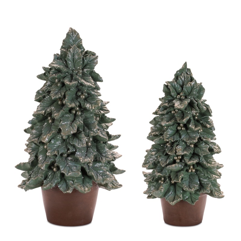 These Holly Leaf Potted Trees are beautiful in their simplicity. A terra cotta styled pot holds the tree of holly leaves adorned with golden berries. Lightly frosted these trees are elegant standing alone or used as a backdrop to a winter or holiday display. Choose from two sizes. Each sold separately. Made of resin.