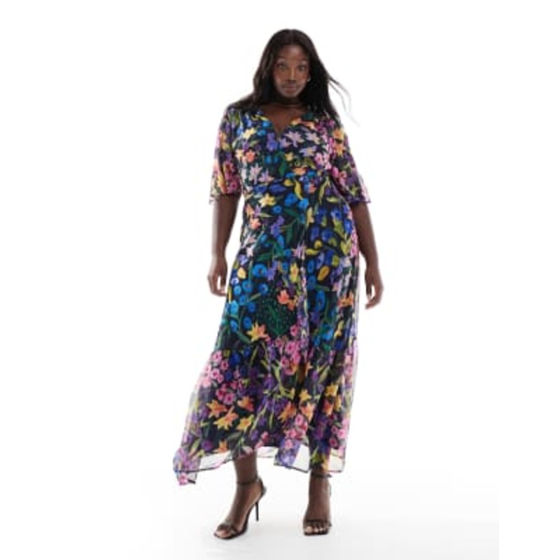 Shop the latest Hope & Ivy Plus flutter sleeve maxi wrap dress with tie waist in purple multi trends with ASOS! Free delivery and returns (Ts&Cs apply), order today!
