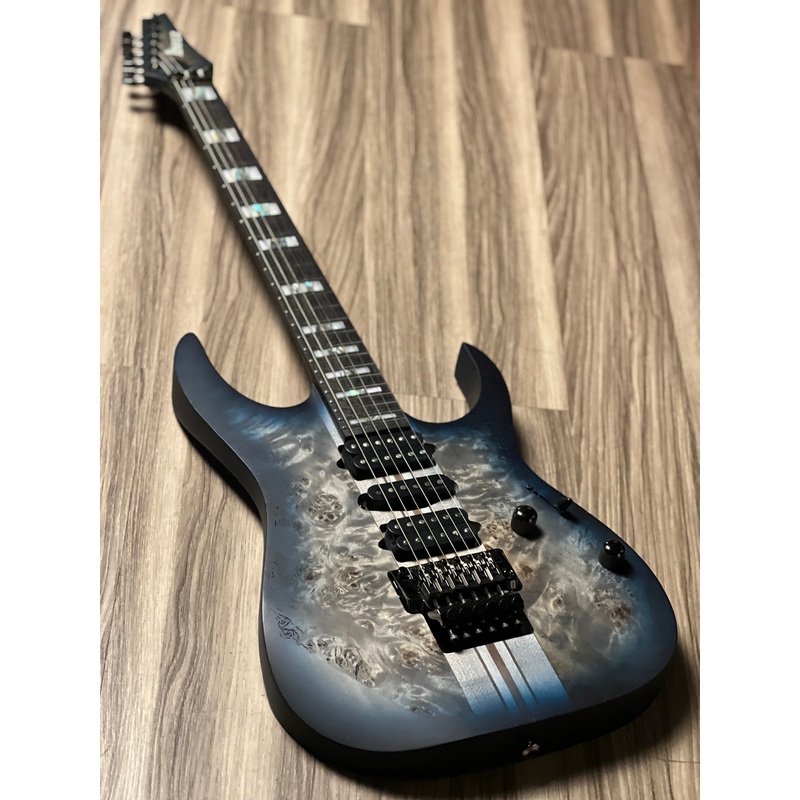 Ibanez introduced the RGT1270PB in 2022, a solid body electric guitar from the RG series. Crafted in Indonesia, it is part of the mid-tier Premium line. The RGT1270PB features neck through body construction with a 3mm thick poplar burl top on American basswood body wings on a maple and walnut Wizard III neck with an ebony fingerboard with acrylic & abalone split block position markers, and 24 stainless steel jumbo frets with Premium edge treatment. Components include DiMarzio pickups with Air Norton and The Tone Zone humbuckers flanking a True Velvet single-coil, an Edge double locking tremolo bridge, cosmo black hardware & Gotoh machine heads.