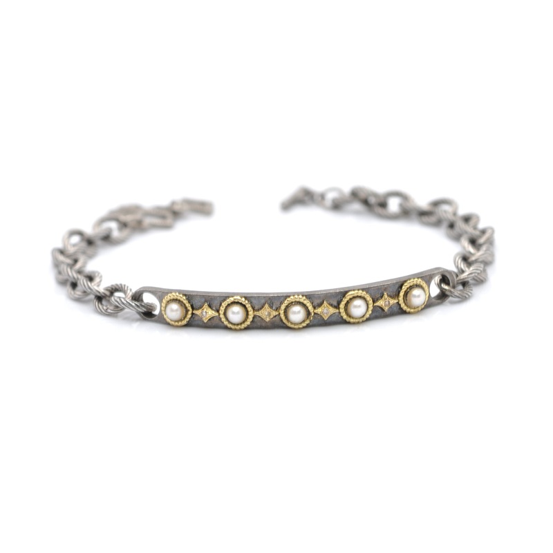 18K Yellow Gold and Blackened Sterling Silver ID Chain Bracelet With Crivelli, White Freshwater, Cultured Pearls and Champagne Diamonds. Adjustable at 7″ and 7.5″. (0.02 TCW)