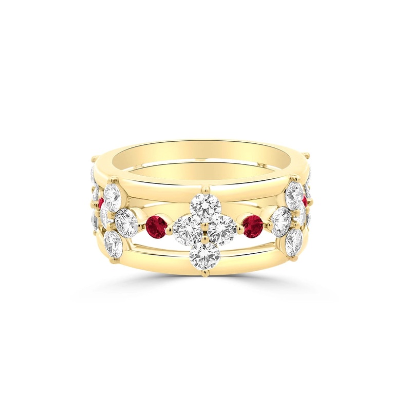 Ladies ruby and diamond ring in 18 karat yellow gold. Set in the wide band ring are four round rubies with a total weight of 0.20 carat and 20 round brilliant cut diamonds with a total weight of 1.55 carat.