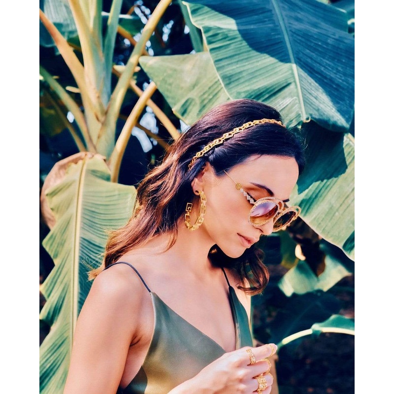 Give the perfect finishing touch to your undos or loose wavy curls with our Jollity Headband! Sleek and elegant in design, the headband is crafted in 18k gold plating and detailed with glinting crystals and our signature monogram.
