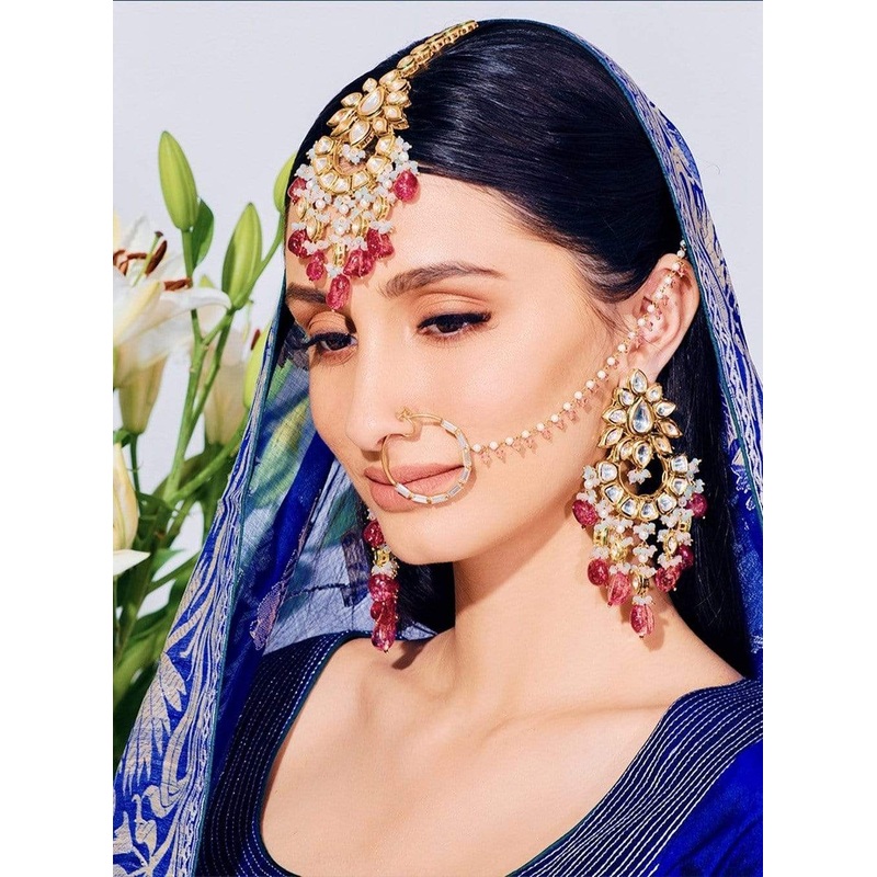 The set consists of the Kaabia Earrings, Kaabia Maang Tikka and Iva Nose Ring.