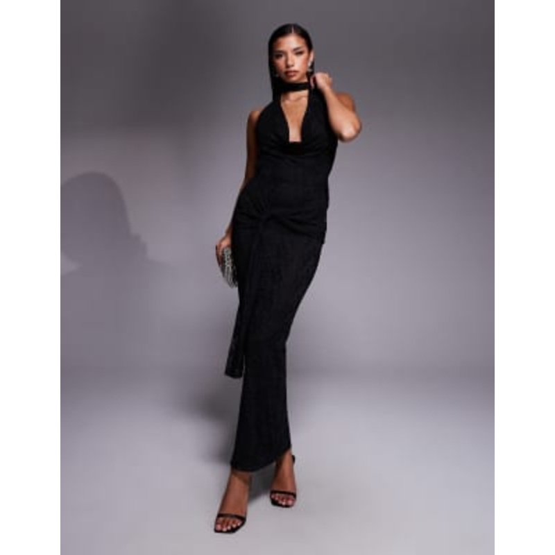 Shop the latest Kaiia exclusive lace deep cowl neck open tie back drape waist detail maxi dress in black trends with ASOS! Free delivery and returns (Ts&Cs apply), order today!