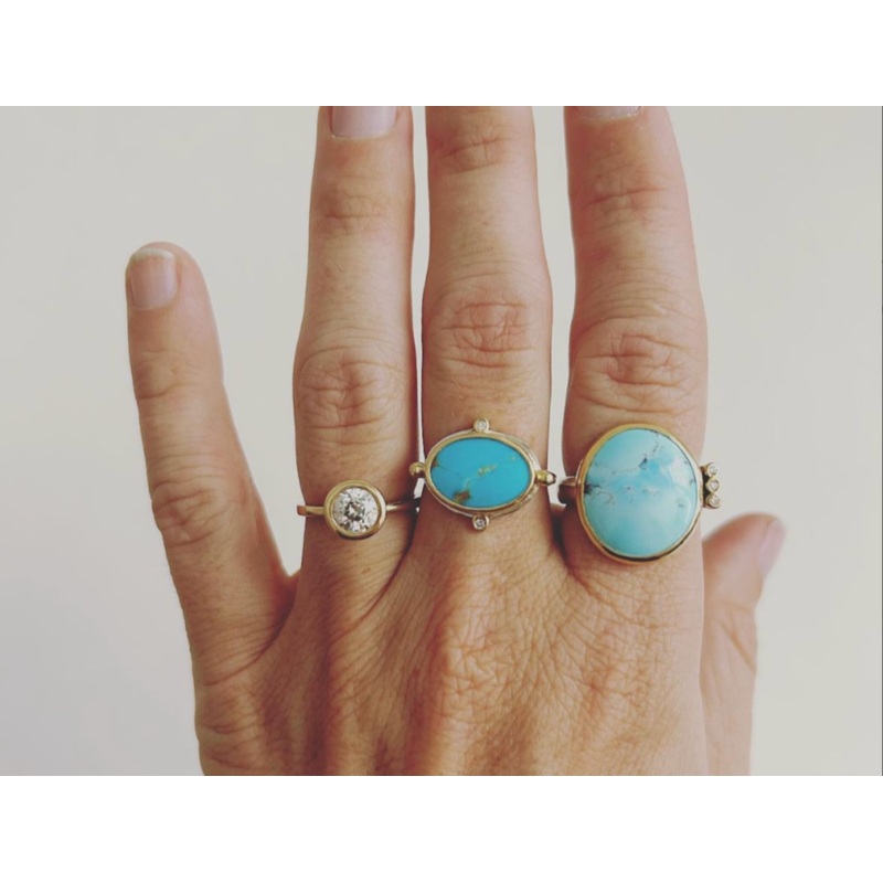 18K yellow gold bezel setting and sterling silver band, compass design with 3 diamond accents, kingman turquoise