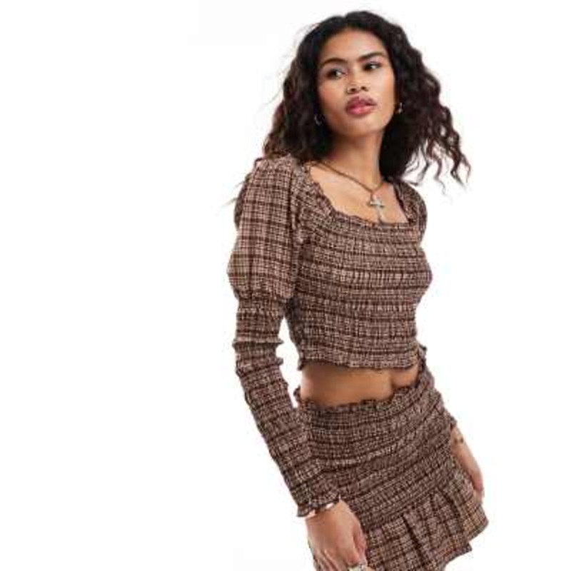 Shop the latest Kiss The Sky ruched top with puff sleeves in brown plaid trends with ASOS! Free delivery and returns (Ts&Cs apply), order today!