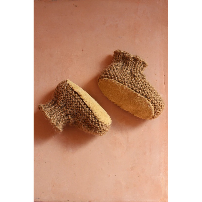 These booties are a special sister collaboration. They are hand knitted on the east coast then sent over to the west coast for the suede soles. She uses baby alpaca yarn, hypoallergenic with thermal properties make it the best material for the little ones.