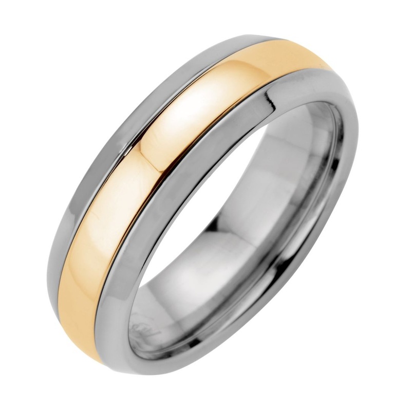 The Kohinoor Duetto engagement ring is made of titanium and it has a yellow gold band around it. The model combining titanium and yellow gold is a good alternative to a traditional gold engagement ring. Titanium is also non-allergenic and thus suitable for even the most sensitive skin. The band profile of the ring is D-shaped and its width is 6 mm. The gold band that goes around the ring is 14 carat recycled yellow gold.