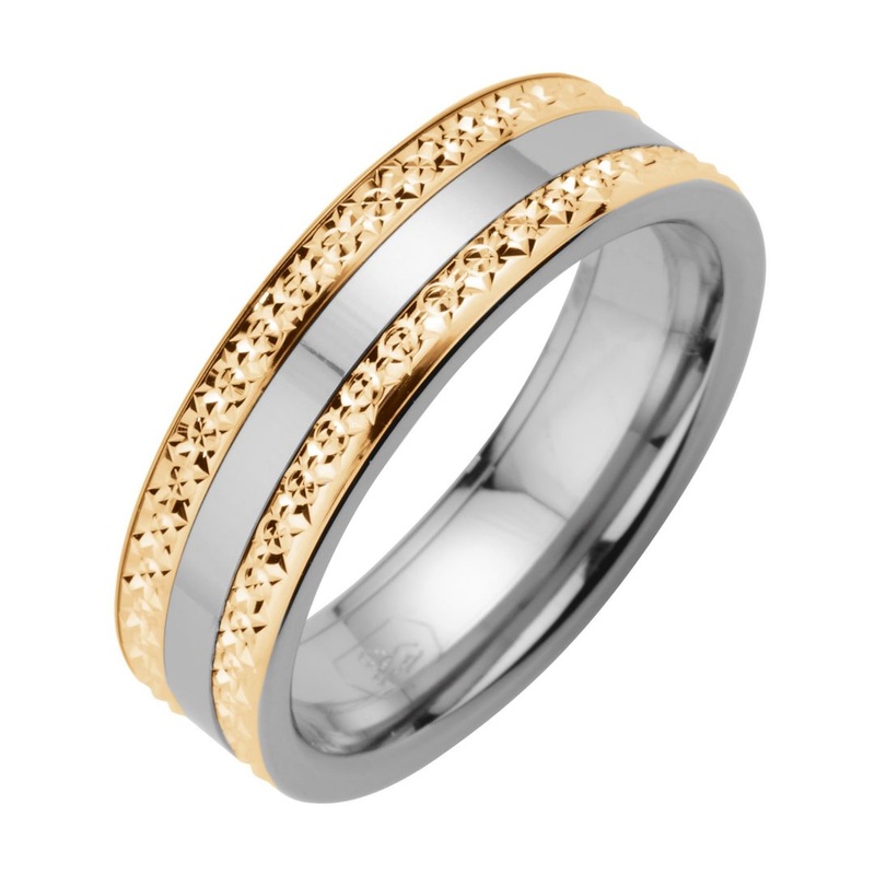 The Kohinoor Duetto engagement ring is made of titanium. The titanium band is surrounded by two yellow gold bands on both sides with a diamond-cut surface. The model combining titanium and yellow gold is a good alternative to a traditional gold ring. Titanium is non-allergenic and therefore suitable even for the most sensitive skin. The width of the Flakka ring is 6 mm. The gold bands that go around the ring are 14 carat recycled yellow gold.