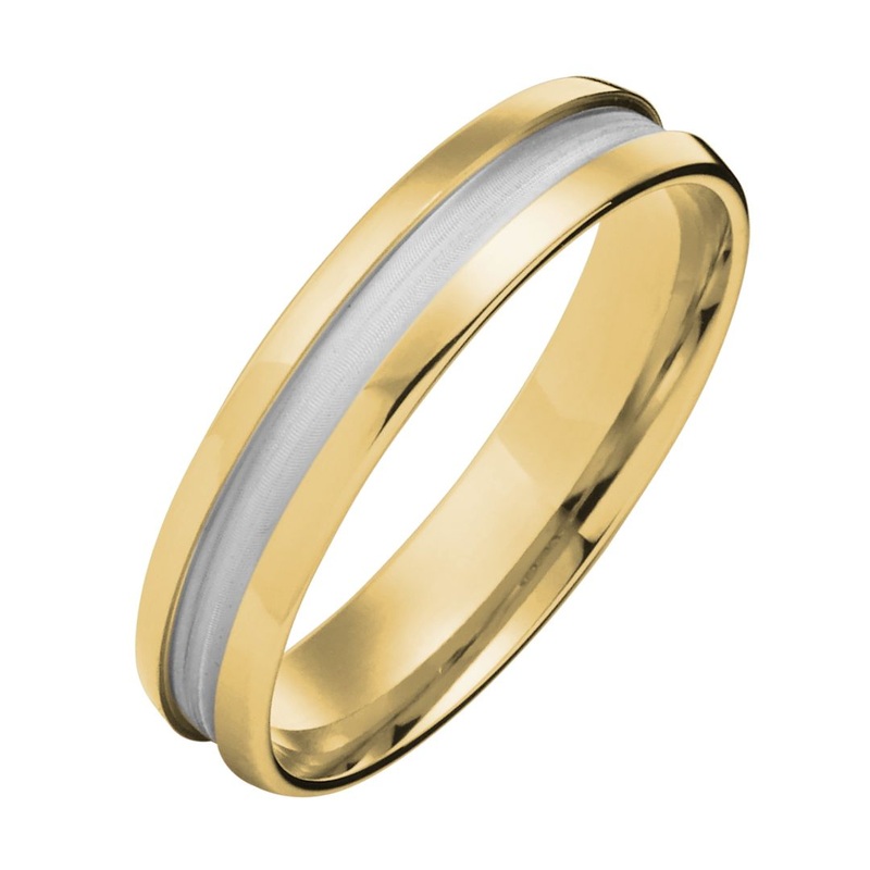 The elegant and simple Kohinoor engagement ring is 14 carat yellow gold and has a light rhodium-plated groove in the middle. The ring is perfect for both men and women. The width of the ring is 4 mm.