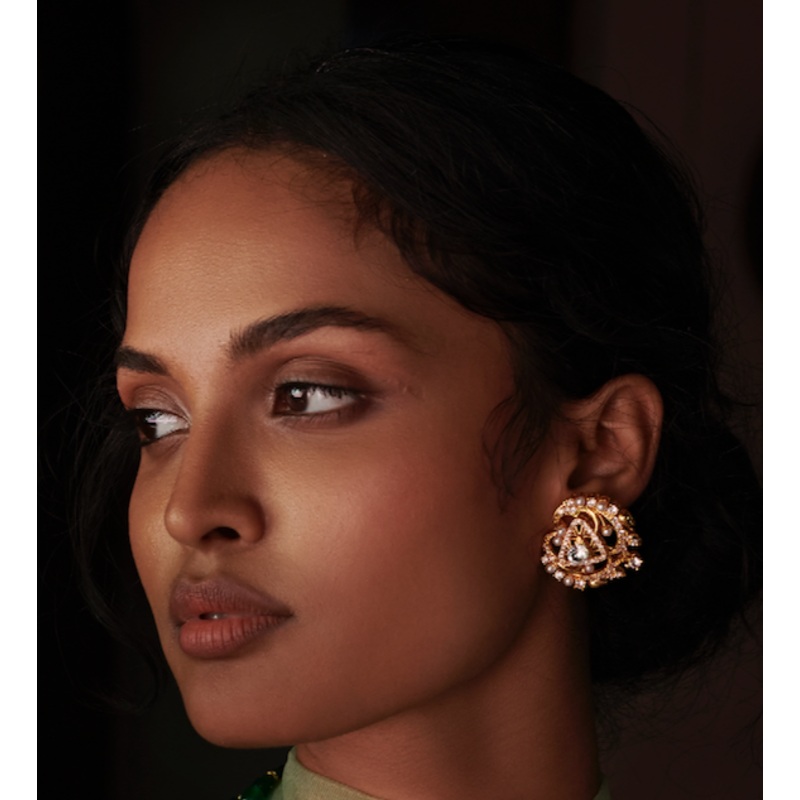 With intricately handcrafted craftsmanship, this earring can be effortlessly paired with any ethnic or contemporary outfit. The combination of gold plating, pearls and stonesis sure to make your look a ten on ten.
