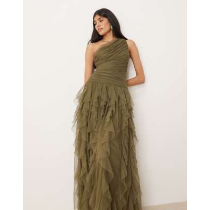 Shop the latest Lace & Beads Bridesmaid one shoulder waterfall ruffle maxi dress in deep olive trends with ASOS! Free delivery and returns (Ts&Cs apply), order today!