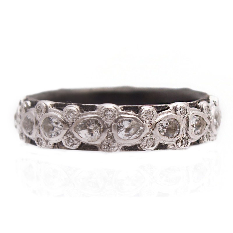 Sterling Silver and Grey Sterling Silver Lacy Eternity stack ring with pear-shaped white sapphires and white diamonds.
