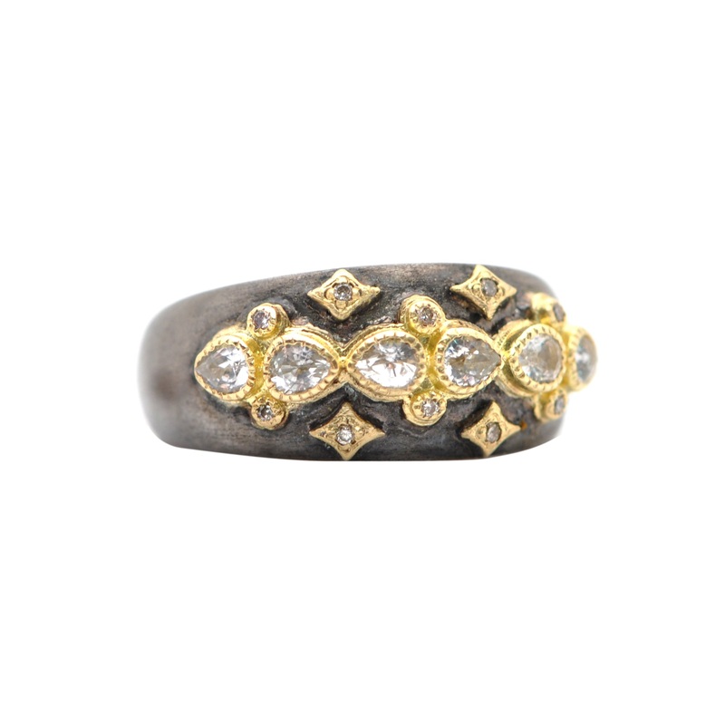 18K Yellow Gold and Blackened Sterling Silver Lacy Stack Band Ring with Pear Shaped White Sapphires and Champagne Diamonds (0.05 TCW)Dimensions:Top Band Width: 0.36" (9.38mm)Bottom Band Width:0.15" (3.95mm)