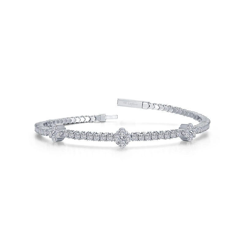 Constructed with comfort and glamor in mind, this flexible station tennis bracelet is set in Lafonn’s signature Lassaire simulated diamonds in sterling silver bonded with platinum.