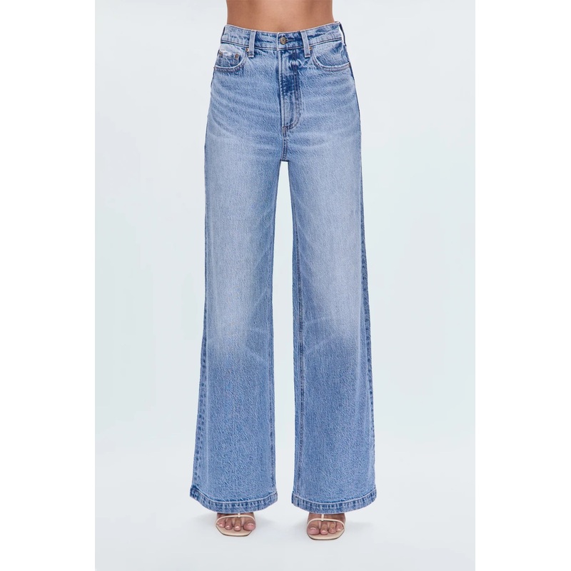 A relaxed, ultra wide leg silhouette with a high rise waist, breezy full length cut, and a clean finish hem. Crafted from our signature comfort stretch denim to provide a structured shape with just the right give.Gallery is a medium-light blue wash decorated with stacked, double waistband design detail.