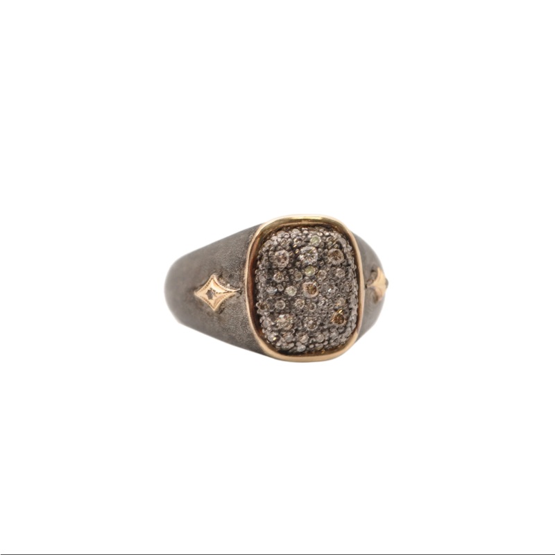 14k Rose Gold and Blackened rhodium finish Sterling Silver 14.2mm pave cushion ring with crivelli and 0.35TCW round champagne diamonds. Measurement L 14.2mm x W 7.1mm. Lower shank measures 6mm.