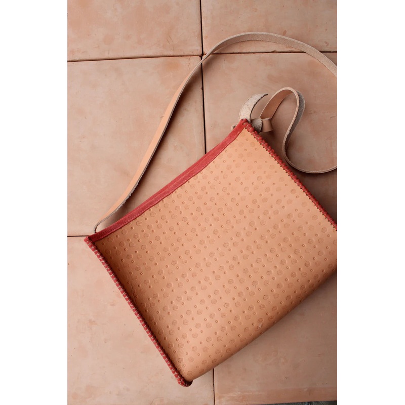 This tote combines colorful suede lining, hand stamped patterns and leather tanned by the sun. Its the perfect size with a adjustable strap so you can wear it as a cross-body or on the shoulder. The sides and pocket are hand stitched with a braided polyester thread that is super durable. The coral suede is the special touch!