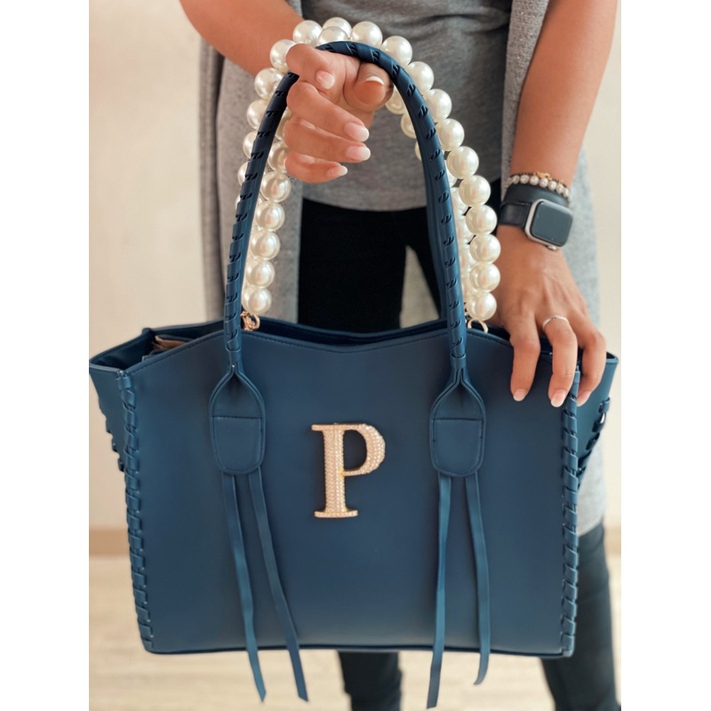 Introducing our chic Lazo Personalized Blue Tote Bag, personalized with a Swarovski studded initial and featuring detachable Pearl handles and made of vegan leather. This versatile and stylish accessory is perfect for adding a touch of glamour to your daily ensemble. Crafted with high-quality materials, our tote bag combines practicality with elegance. Shop now and elevate your fashion game with a personalized vegan leather tote adorned with opulent Swarovski crystals and versatile Pearl handles. Experience the perfect blend of style and functionality today.
