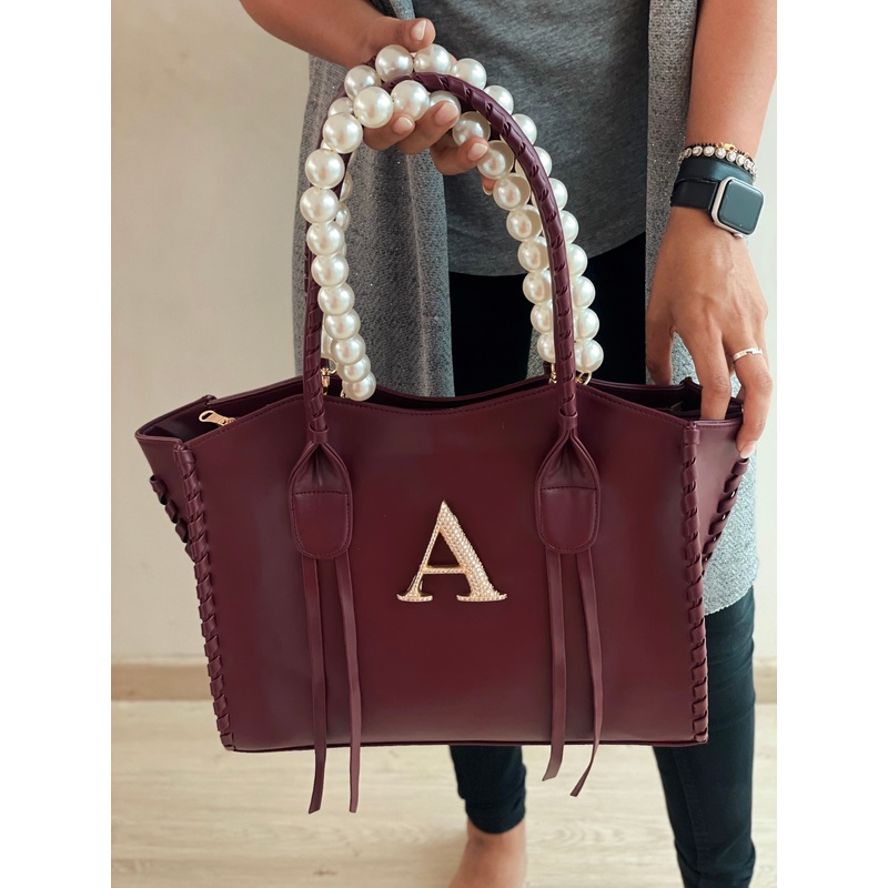 Introducing our chic Lazo Personalized Burgundy Tote Bag, personalized with a Swarovski studded initial and featuring detachable Pearl handles and made of vegan leather. This versatile and stylish accessory is perfect for adding a touch of glamour to your daily ensemble. Crafted with high-quality materials, our tote bag combines practicality with elegance. Shop now and elevate your fashion game with a personalized vegan leather tote adorned with opulent Swarovski crystals and versatile Pearl handles. Experience the perfect blend of style and functionality today.